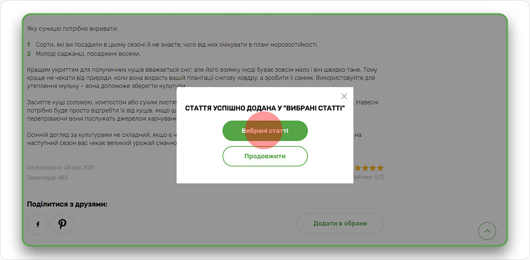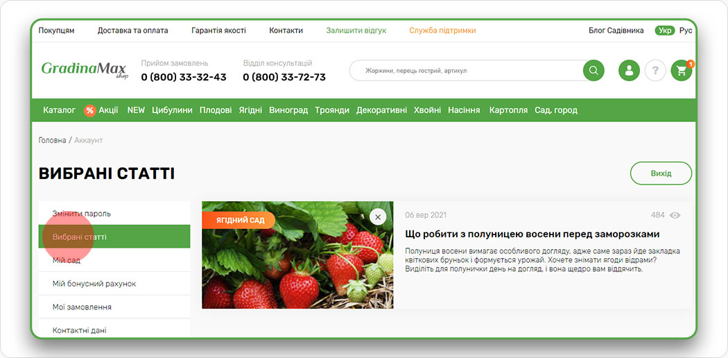 4. Любую понравившуюся статью из нашего садового блога вы можете добавить в «Избранное» и прочесть ее потом, когда она будет нужна. Вкладка с избранными статьями отображается в личном кабинете.