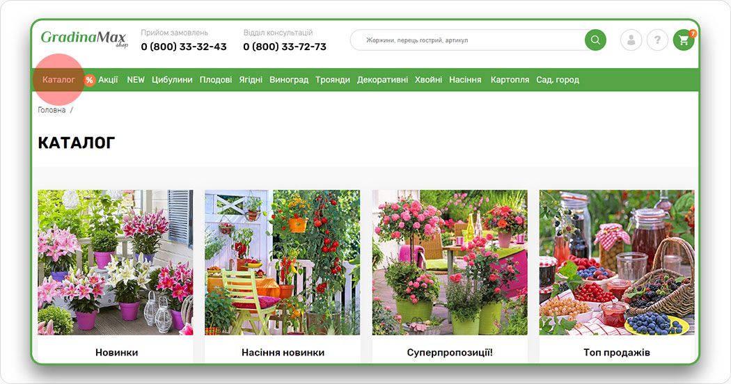 Также можно нажать на вкладку «Каталог продукции» и перейти на нужную вам группу растений.