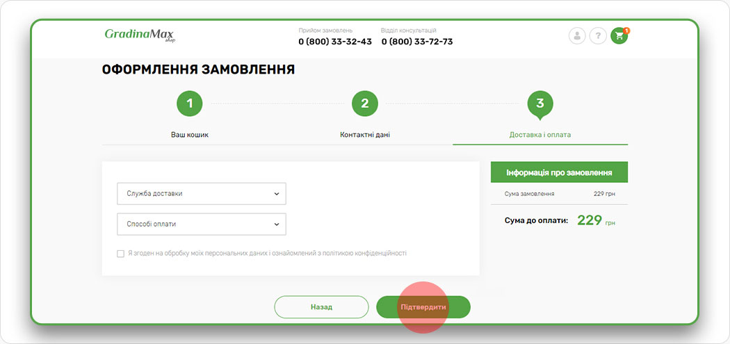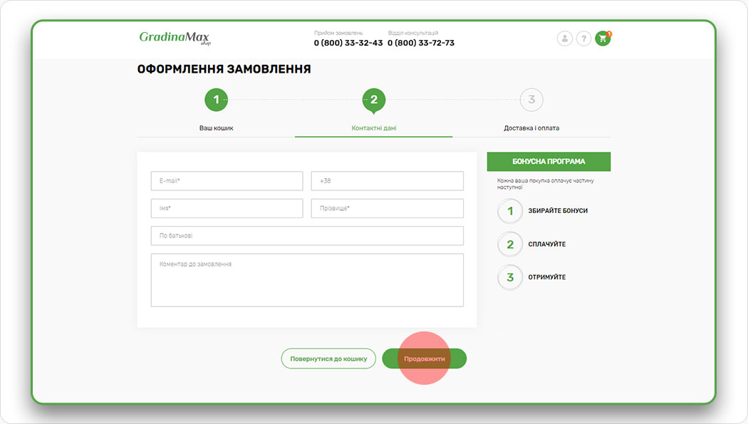 Нажмите на кнопку – Продолжить и заполните анкету покупателя, внеся в нее личные данные и контактные данные. Выберите способ оплаты (наложенный платеж или онлайн оплата) и способ доставки (Нова почта или Укрпочта).