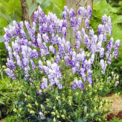Аконит двухцветный сразу обращает на себя внимание соцветиями белого цвета с широкой фиолетово-синей окантовкой. Растение называют шлемовиком. Название пошло от формы бутона. Верхние лепестки срастаются и напоминают шлем. Нижние лепестки подгибаются под верхние, формируя подобие забрала. Покупайте корневища аконита (борца) двухцветного, и на вашем участке появится шикарная армия эффектных цветов на мощных высоких цветоносах, до 1,5 м, с тёмно-зелёной листвой.