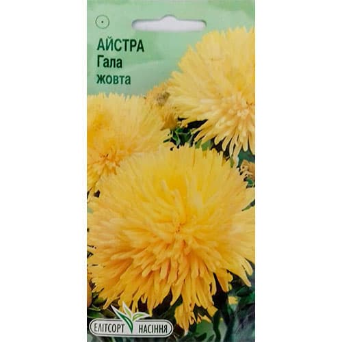 Астра Гала жёлтая - красивый популярный однолетник. Куст компактный, прямостоячий, высотой 80 см. Цветки крупные, до 10 см в диаметре жёлтой окраски. Зацветает с середины августа и цветет до наступления холодов. Растение используют для бордюров, патио и оконных коробок, подходит для среза.