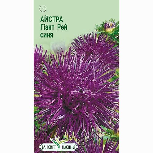 Астра Гиант Рэй синяя - популярный однолетник. Куст компактный, прямостоячий, высотой 55-60 см. Цветки крупные, до 12-14 см в диаметре, синей окраски. Цветет с середины июля до наступления холодов. Семена высевают в марте-апреле в теплицу или парник и выращивают через рассаду или в апреле-мае непосредственно в грунт. При температуре 18-21 ° С всходы появляются на 6-15 день. Лучше растет на солнечных участках с питательной почвой. Используют преимущественно на срез, в групповых посадках и в цветниках.