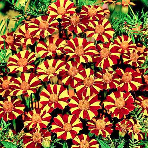 Бархатцы Денди — растение с оригинальным окрасом цветов. Куст, разветвленный в верхней части, увенчан удивительными головками цветов. Лепестки яркой, солнечной окраски по боковым линиям окаймлены бордовыми полосами. Вид цветка сверху напоминает полосатый зонтик над детской каруселью. Цветы радуют своей красотой с июня по октябрь.