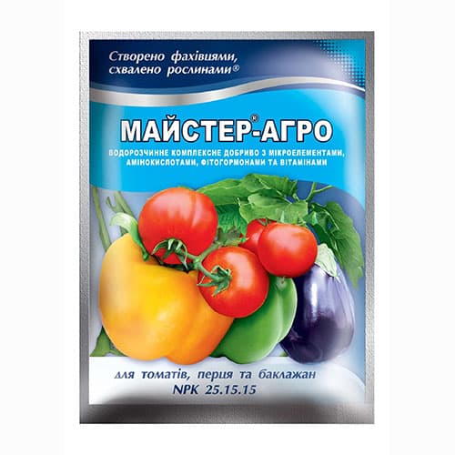 Эффективное водорастворимое, безхлорное комплексное удобрение с микроэлементами в форме хелатов. Применяется для корневой подкормки томатов, перца и баклажанов. Состав удобрения: азот (N) - 25%, фосфор (P2O5) - 15%, калий (K2O) - 15%, MgO, B, Cu, Zn, Mn, Fe, Mo.