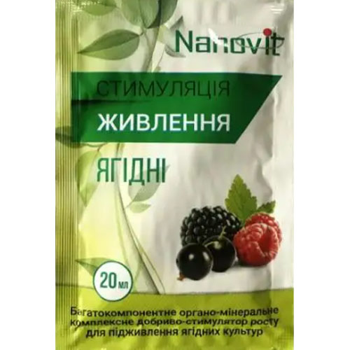 Удобрение Nanovit для ягодных – это многокомпонентное органо-минеральное жидкое удобрение и стимулятор роста малины, смородины, ежевики, жимолости, крыжовника и других ягодных культур, содержащее в своем составе азот (N), фосфор (Р), калий (К), серу (S) и комплекс микроэлементов (B, Cu, Fe, Mn, Zn) в хелатной форме, а также аминокислоты, гуминовые кислоты, фульвовые кислоты, фитогормоны, моносахариды, полисахаридный прилипатель.