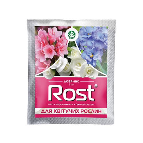 Удобрение Рост для цветущих растений – органо-минеральное удобрение для ухода за комнатными растениями. Системное использование удобрения стимулирует развитие корневой системы. А также увеличивает массу надземной части растения. Обеспечивает образование большого количества и большего размера цветков, которые приобретают более интенсивную окраску. Увеличивает продолжительность цветения, способствует общему росту и развитию комнатных растений.