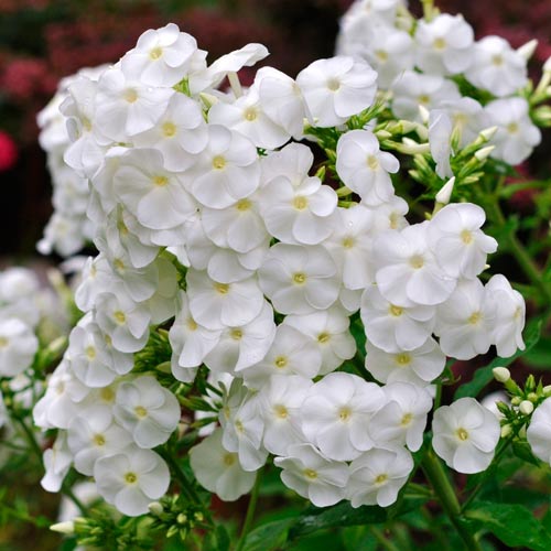 Флокс метельчатый Вайт имеет мощный стебель, на котором образуются пышные пирамидальные шапки цветов. Бутоны закладывает с середины лета до наступления осенних заморозков. Цветы белые, с нежными лепестками. Растение эффектно смотрится в монопосадках, особенно в композициях с флоксами ярких цветов.