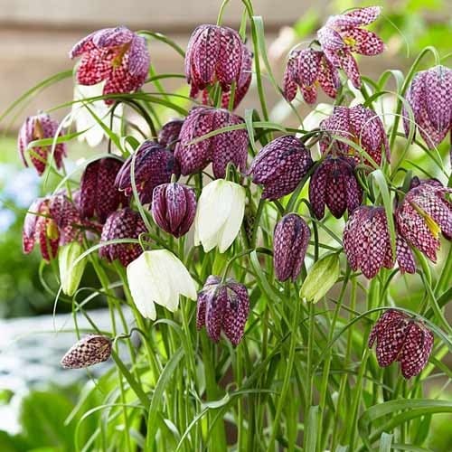 Рябчик (фритиллярия) Мелеагрис, микс - это специально подготовленный набор самых красивых сортов с учетом высоты и сроков цветения растений. В миксе сорт с бело-зелеными цветками с нежным рисунком на лепестках и самый популярный бордово-фиолетовый сорт с отчетливым шахматным рисунком. Крупные колокольчатые цветки, направленные вниз, появляются на нежных стеблях с апреля по май. Растение прекрасно смотрится в группе на клумбах, цветниках, клумбах или газонах. цветы шахматной доски (Fritillaria), смесь также можно срезать для букетов и композиций.