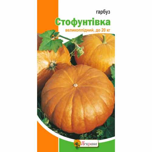 Тыква Стофунтовка - старый сорт народной селекции. Сорт среднеспелый, срок созревания 110-115 дней. Растение с большими плодами, весом о 20-50 кг, выращивают для домашней кулинарии и консервации. Тыкву варят и запекают, перетирают на пюре и выжимают сок, готовят из него цукаты, варенье. Полезные свойства тыквы используют в лечебном и диетическом питании: вкусная сладкая мякоть содержит витамины А, С, РР, В и микроэлементы калий, магний, железо.