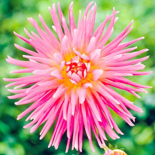 Георгина Нью Дименшион — яркая кактусовидная красавица с плотными ярко-розовыми цветами диаметром до 20 см. Лепестки длинные, трубчатые, кокетливо изогнутые на концах. Сердцевина имеет лимонно-желтый оттенок. Цветет с середины лета до поздних осенних заморозков.