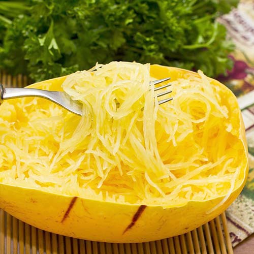 Кабачок спагетти Порционный отличается своим исключительным окрасом: это крупные ярко-оранжевые плоды. Вес одного достигает около 1 кг. Мякоть у сорта волокнистая, присутствует выраженный аромат ванили. Плоды подходят для запекания целиком. Также серединку отваривают на протяжении 20 минут, затем шинкуют на тонкую лапшу, приправляя различными соусами. Купите качественные семена кабачка спагетти в интернет-магазине «GradinaMax» – заказ отправится к вам уже завтра.
