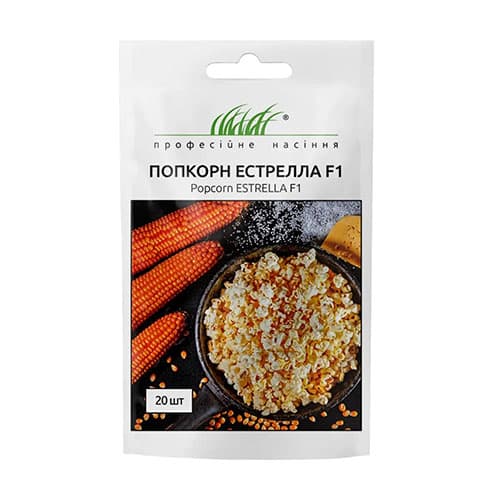 Кукуруза попкорн Эстрелла F1 - поздний гибрид кукурузы. Растение очень мощное, высотой 1,8 – 2,0 м. Формирует по 2 кочана цилиндрической формы, темно-желтого цвета, длиной 18-20см.16-18 рядов зерен. Чрезвычайно пластичный гибрид. Вегетационный период растения составляет 95 дней. Хорошо адаптируется к разным видам почв. Рекомендуется выращивать для приготовления попкорна. Главным отличием этого гибрида является наличие внутри каждого зерна капельки воды и крахмала, которая разрывается при нагревании. Более 90% зерен раскрывается.Зерно раскрывается в форме «бабочки». Кукуруза богата витаминами В1 и В2.