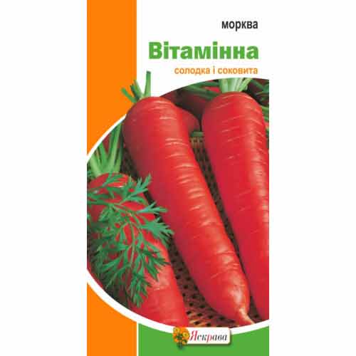 Морковь Витаминная - превосходный сорт моркови, идеально подходит для детского питания. Сроки созревания ранние, 80-100 дней. Плоды тупоконечные, цилиндрической формы, насыщенного оранжевого цвета, до 20 см в длину, весом до 165 г. Сорт отличается большим содержанием сахара, каротина и витаминов. Сорт пригоден для посева весной, летом для получения урожая на хранение, и под зиму.