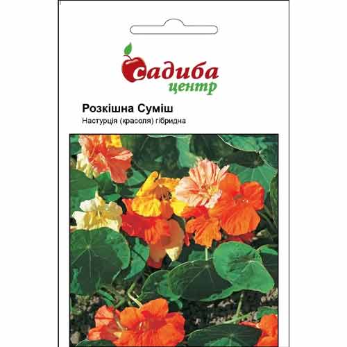 Настурция Роскошная смесь – замечательный летник с ползучим стеблем и бутонами диаметром до 6 см белого, розового, красного, желтого и оранжевого оттенка. Цветет долго, сплошным ковром, с июня до осенних заморозков. Купить семена настурции Роскошная смесь можно для украшения окон и балконов, беседок, создания ландшафтных фигур.