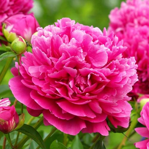 Сорт выведен в Китае, изображение цветка украшает эмблему этой страны. Растение восхищает взгляд темно-розовыми цветками с изогнутыми нежными лепестками и станет настоящим королем на клумбе. Распустившиеся бутоны излучают приятный аромат и достигают в диаметре 16-20 см. Высота куста – 80-100 см, ажурные зеленые листья обретают к осени багровые оттенки. Стебли устойчивые, не ломаются под весом крупных цветков. Купите корневища пиона Карл Розенфельд и любуйтесь каждый год его эффектным цветением.