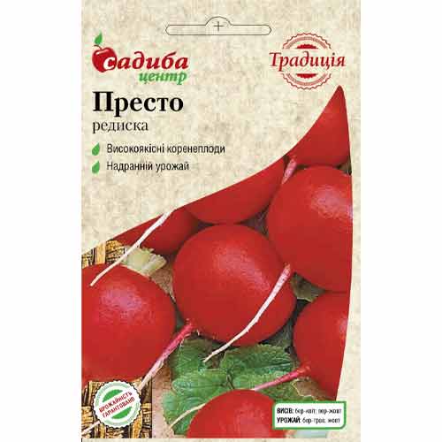 Редис Престо – это скороспелый сорт, созданный для получения ранних урожаев. Готов к уборке через 16-18 дней после посева. Корнеплоды красные, с белой мякотью, сочные и нежные, почти без горечи, весом до 11 г. Не боятся заморозков, не растрескиваются, устойчивы к стрелкованию. Сорт подходит для выращивания в пленочных укрытиях и в открытом грунте.