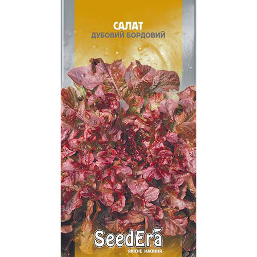 Салат листовой Дубовый бордовый – это скороспелый сорт с периодом жизни до 60 дней. С одного растения можно получать свежие листья более месяца. Лист сильно похож по форме на дубовый. Край гофрированный, на одной листовой пластине можно видеть насыщенно бордовый, коралловый и зеленый оттенки. Зелень применяется для приготовления летних салатов, в качестве приправы к жареному и запеченному мясу.