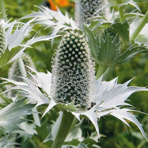 Синеголовник Вайт — экзотический белый сорт с металлическим блеском. У основания каждого соцветия образуется подобие эффектной чаши, сформированное остроконечными сильно перистыми листьями обертки. Кусты высотой до 80 сантиметров. Растения этого сорта широко применяются в садовом дизайне альпинариев и злаковых композиций, а также в зимних букетах, поскольку не меняют цвет и форму после срезки.