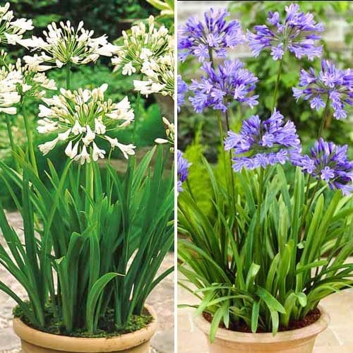 Набор из 2 сортов содержит 2 луковицы привлекательных сортов - голубой агапантус, белый агапантус. Цветы красиво смотрятся на клумбах или в качестве украшения больших горшков и контейнеров, расставленных на балконах или террасах. Белый агапантус отличается красивыми изящными белыми цветками в форме колокольчиков, а голубой агапантус можно узнать по интенсивно-синему цвету колокольчиков.