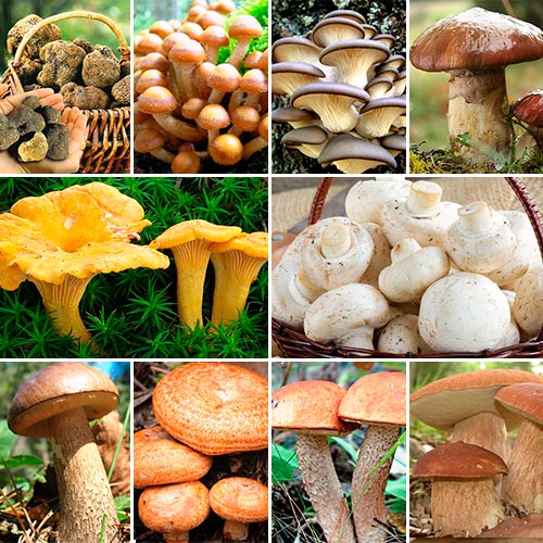 Традиционные и всем известные Шампиньон и Вешенка обыкновенная. Лесные грибы: Опенок летний, Рыжик обыкновенный, Подосиновик, Масленок, Подберезовик обыкновенный. Суперполезная желтая Лисичка, которая сама не подвергается нападкам насекомых-паразитов и помогает очистить от них организм. И, наконец, наиболее ценные Белый гриб и Черный трюфель.