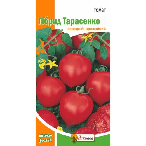 Томат Гибрид Тарасенко - относится к среднеспелым сортам, форму имеют каплевидную, округлую. Высота куста 150-170 см, средний вес плодов 100 г. Плотная кожица позволяет консервировать помидоры целиком, достаточно долго хранить и перевозить. Мякоть сочная, вкусная отлично подходит для приготовления вторых блюд или закусок, эти помидоры не заменимы в летних салатах.