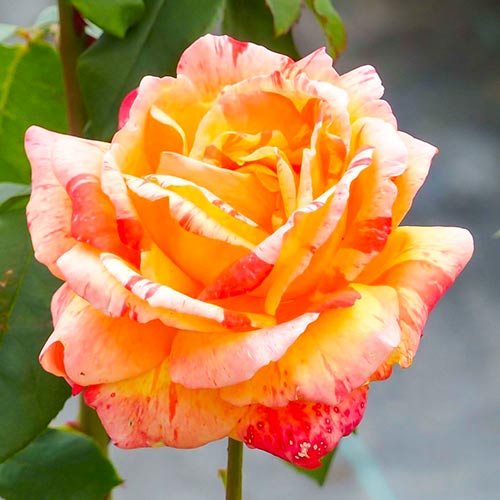 Чайно-гибридная роза Андре Виллемс – сильнорослый сорт, высотой около метра с необычными красно-оранжевыми крапчатыми цветками. Цвет лепестков меняется по мере развития розы. Для сорта характерно повторное цветение, а это значит, что радовать королева сада будет вас всё лето.