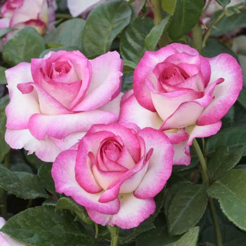 Роза флорибунда Ламинуэт – это проверенный временем сорт. Его особенность – двухцветные лепестки белые или кремовые у основания и с розовой кромкой. Изначально выведен в качестве срезочного сорта. Куст вырастает до 75 сантиметров в высоту и 50 сантиметров в диаметре.