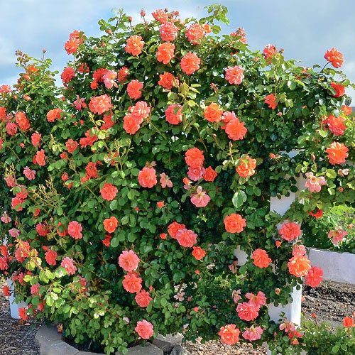 Роза плетистая Оранж Лемон — оранжево-лососевый клаймбер с крупными цветками и мощными побегами. Сорт современный, выведен с учетом повышенных требований к иммунитету и неблагоприятным погодным условиям. Кусты мощные, раскидистые, побеги до 2 метров высотой, нуждаются в шпалере. При обрезке увядших цветочных кистей через 15-2 месяца зацветает повторно.
