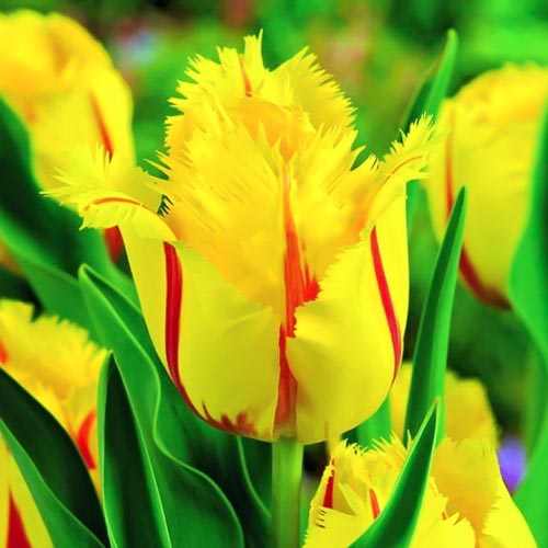 Тюльпан бахромчатый Фламенко – многолетнее весеннее луковичное растение с лепестками желтого и красного цвета, напоминающие пламя и проходящие по центру цветка. Размер бутона до 9 см, высота растения 30-40 см. Период цветения — апрель-май. Дарит приятный, нежный аромат. Используют для садового декорирования. Можно срезать и оформлять в букеты, соединяя с тюльпанами Свит Симон и Блэк.