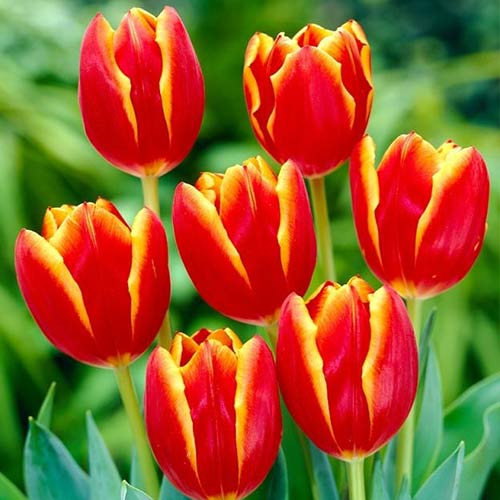Тюльпан Триумф Лаура Фьюджи - среднерослое растение из семейства Лилейных (до 50 см) с крепким стеблем. Его ярко-красный цветок в виде бокала примечателен ярко-жёлтой каймой по краю лепестков. Цветение начинается в конце апреля.