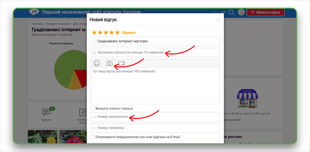 6. Опишіть загальне враження від покупки в нашому інтернет-магазині, а також по можливості додайте фото вашої посилки чи рослини, яка виросла та вкажіть номер замовлення.