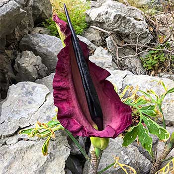На метровому квітконосі на початку літа з'являється величезне суцвіття-початок близько 40 см в довжину. Забарвлене воно в темний, майже чорний відтінок і дуже ефектно виглядає на тлі бархатистого покривала глибокого винного відтінку. На щастя, цвітіння триває зовсім недовго, буквально кілька днів, тому що, розпускаючись, квітка пахне тухлим м'ясом, привертаючи до себе запилювачів – жуків і мух.