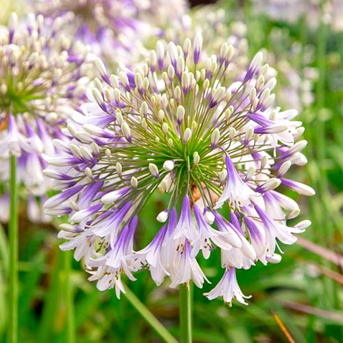 Агапантус Феєрверк дає високий потужний квітконос, який увінчано шаровидно-парасольковим суцвіттям, що досягає 30 см в діаметрі. Бутон розкривається поступово, тому милуватися трансформацією можна протягом двох місяців. У розпуску квітка складається з безлічі дзвоникоподібних квіток із довгими тонкими черешками. Чашечка, лілова біля основи, до країв пелюсток стає білосніжною.