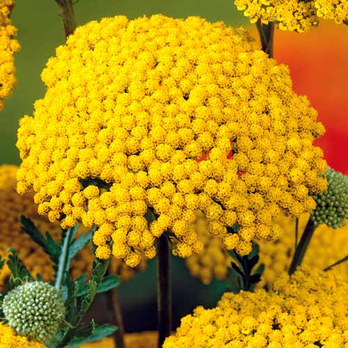 Ахілея (деревій звичайний) Єллоу (Achillea Mill. Yellow) – яскравий жовтий сорт з великими округлими суцвіттями-корзинками, по мірі зростання утворює розлогі кущі близько 60 см заввишки. Дуже декоративний багаторічник, який успадкував від свого дикого пращура дивовижну життєстійкість і отримав від селекціонерів здатність красиво цвісти в тіні. Не потребує зимового укриття. Справжня знахідка для садівників, які підбирають рослини для змішаних посадок в тінистих куточках.
