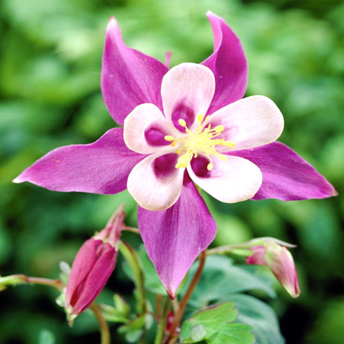 Аквілегія гібридна (Aquilegia McKana Hybrids) – популярна великоквіткова рожево-бузкова культура, яка повсюдно зустрічається в садах і парках, оскільки охоче розмножується самосівом. Квітки в діаметрі 5-7 см і більше, мають пониклу головку-дзвіночок із 5 пелюстками і шпорцями, загорнутими до неба. Рослина може рости буквально повсюдно. Цвітіння подовжується з травня по липень. У центрі кожного трійчастого розсіченого листа вранці або після дощу накопичується велика крапля води, завдяки чому квітка отримала другу назву – водозбір. Це абсолютно невибагливий морозостійкий багаторічник. Зберігає видові характеристики на протязі 5 років, після чого втрачає їх, а колекція аквілегій потребує оновлення сорту.