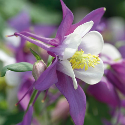 Аквілегія гібридна Сван Лавендер (Aquilegia Swan Lavender) – чудова бузкова рослина з білими пелюстками всередині. Квітки досягають 10 см в діаметрі, кущі потужні, рослі, висотою до 80 см. Американський гібрид має довгі тонкі шпорці, кожен з яких закінчується жовтою «бусинкою». Невибаглива багаторічна культура рясно цвіте з травня по липень на сонці і в півтіні. Не потребує зимового укриття.