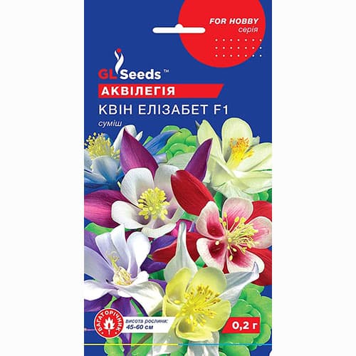 Аквілегія Квін Елізабет - багаторічне ростіння, що виростає компактним кущиком заввишки 50-70 см. Ажурне сіро-зелене листя становлять витончену розетку, декоративну навіть без квіток, так що рослина підійде і на перший план міксбордера, і на у куточок у фольклорному стилі. Квітки діаметром 5-8 см складної форми з п'ятьма пелюстковим віночком і довгими шпорцями. Забарвлення в різноманітних відтінках синього, фіолетового, червоного, жовтого, білого та рожевого кольорів. Купуйте насіння аквілегії в нашому магазині – виростити цю невибагливу квітку просто, а завоює він ваше кохання надовго!