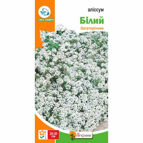 Алісум білий - невисокий однорічник, заввишки до 5 - 10 см, з дрібними квітками з медовим запахом. Утворює щільний килим, що стелеться білого кольору. Листя вузькі, ланцетні. Цвіте з червня до осені. Для безперервного цвітіння періодично видаляють зів'ялі квіти і плоди (якщо не потрібні насіння). Використовують для обрамлення клумб, балконних ящиків, на кам'янистих гірках, рокаріїв, для посадки між плитками доріжок.
