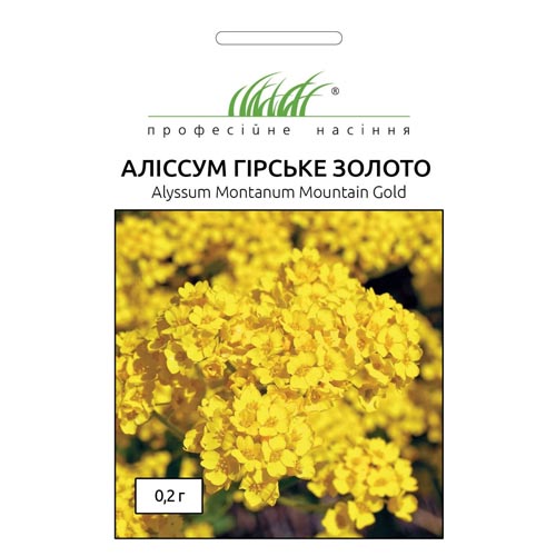 Аліссум Гірське золото — багаторічна рослина з безліччю дрібних яскраво-жовтих квітів і солодким ароматом. Формує круглі кущі, шириною до 40 см. Зацвітає на наступний рік після посадки, цвітіння зазвичай триває 40 днів. Його можна продовжити, вчасно видаляючи відцвілі суцвіття.