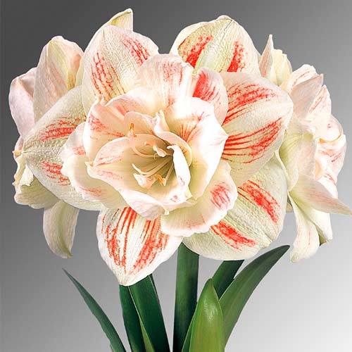 Амариліс (гіпеаструм) махровий Німф – кімнатна рослина, з махровими кремовими квітками та червоно-коричневими прожилками на пелюстках. Її висота досягає 70 см, а діаметр – 25 см, на квітконосі формується 4 великих красивих бутона.