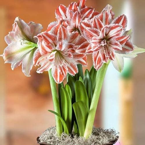Дансінг Квін – махровий амариліс з великими (від 20 до 25 см в діаметрі) білими квітками з червоно-оранжевими смужками на пелюстках. Рослина дає від 1 до 3 квітконосів. На кожному з них формується по 3 бутони. Купіть цибулини амариліса (гіпеаструма) Дансінг Квін і через 8-10 тижнів після посадки побачите, як дивно виглядає квіткова Танцююча Королева.