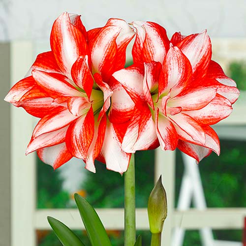 Амариліс Екзотік Пікок – красива багаторічна цибулинна рослина з лінійно-язикоподібним листям. На високих потовщених квітконосах ростуть напрямлені вгору, великі червоно-білі квіти з ніжним приємним ароматом. Коли вони повністю розпускаються, пелюстки грайливо відгинаються, змінюючи форму. Купуючи цибулини амариліса (гіпеаструма) Екзотік Пікок, ви придбаєте квітку, яка буде захоплювати всіх своєю екзотичною красою.