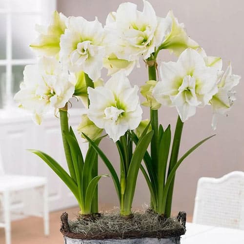 Амариліс (гіпеаструм) махровий Джевел – благородний цибулинний багаторічник, який прикрасить будь-який інтер'єр. Висота квітконоса – 50 см. На ньому формується кілька бутонів. Снігова білизна пелюсток підкреслена жовто-зеленої серединкою. Діаметр квіток перевищує 15 см, вони чудово виглядають на тлі довгої вузької листя. Щоб отримати ошатний букет, в горщик досить посадити лише одну цибулину.