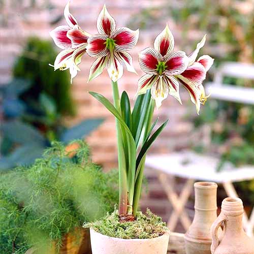 Папілліо – висока рослина з великими квітками. Вирощується як кімнатна, проте в літній період може бути висаджена у відкритий ґрунт. Квітконоси у висоту досягають 50 см. На кожному розпускається до шести бутонів, які за формою нагадують квітки орхідей. Купіть цибулини амариліса (гіпеаструма) Папілліо та отримайте культуру з двоколірними квітками, забарвлення яких варіює від вершково-білого до яблучно-зеленого. По центру пелюсток проходять коричнево-вишневі смужки.