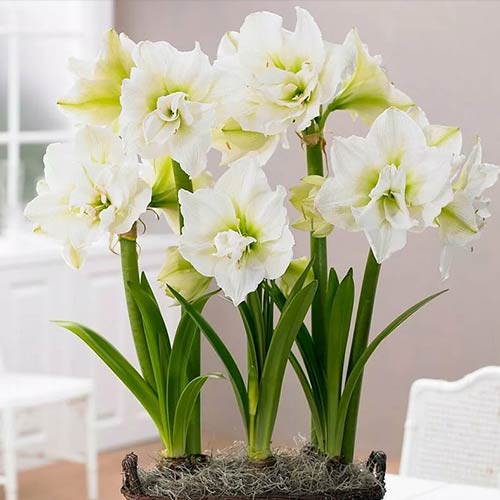 Амариліс (гіпеаструм) Вайт Пікок розпускається розкішними ванільно-білими квітами. Рослина вирощується в горщиковій культурі з посадкою по одній цибулині у вазон. На ділянці служить прикрасою передньої лінії рабаток і міксбордерів. Квітконіс є прямостоячим стеблом, який охоплено біля основи вузькими лінійними листками. Воронкоподібні махрові квіти досягають 25 см у діаметрі.