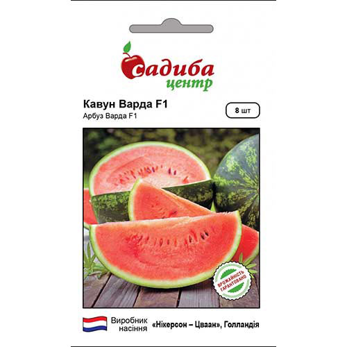Кавун Варда F1 - врожайний, середньостиглий (вегетаційний період близько 70 днів). Вага овальних яскраво-смугастих плодів - від 10 до 15 кг. Добре піддаються транспортуванню. М’якоть ніжна, солодка, яскраво-червона, з насиченим смаком та ароматом. Завдяки міцній та розгалуженій кореневій системі кавун чудово адаптується до різних типів ґрунтів і дає гарні врожаї навіть в посушливе літо. Також гібрид Варда має особливу стійкість до грибкових захворювань.