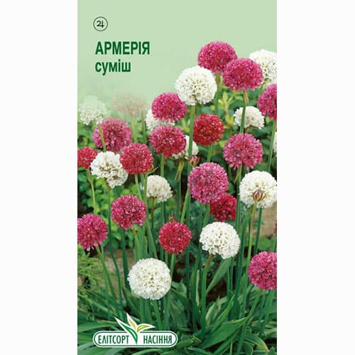 Армерія, суміш забарвлень - оригінальні кулясті суцвіття красиво височіють над подушками листя. Рослина висотою близько 50 см. Листя вузьке, лінійне, зібране в розетку. Квіти у головчастих суцвіттях до 4 см у діаметрі