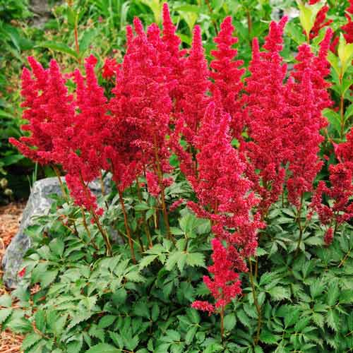 Астільба японська Монтгомері – яскравий та ефектний сорт з ароматними волотистими суцвіттями яскраво-червоного відтінку. Вони формуються на довгих квітконосах, висота яких сягає 50-80 см. Розпускаються в першій половині літа. Цю пишність «підтримує» подушка з малахітової зелені. Листя подовжене, із зубчастим краєм. Замовляйте саджанці астільби японської Монтгомері – це універсальна культура, яка добре виглядає на клумбах, в альпінаріях та у бордюрній посадці. Рослина дуже ефектна у поєднанні з хостами.