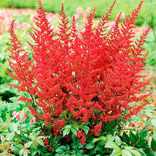 Астільба японська Везувій (Astilbe Vesuvius) – популярний різновид культури, що відрізняється середніми розмірами куща й оригінальним листям, яке міняє з віком своє забарвлення. Запашні квітки зібрані в густі волотисті суцвіття розміром близько 15 см. Пухнасті ажурні волоті, полум'яніючі винно-червоним, і правда нагадують колір лави.