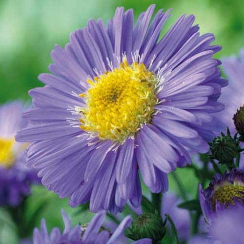 Численні пахучі квіточки з тонкими синіми пелюстками та жовтою серединкою яскраво виділяються на клумбі. Вони з'являються наприкінці серпня і радують свої виглядом до заморозків. Кущ досягає висоти 40-50 см, красиво виглядає вздовж доріжок, біля альтанки, на тлі каменів. Айстри відмінно виглядають в одиночній та груповій посадці. Сорт посухостійкий, невибагливий у вирощуванні, підходить для зрізки в букети. Купіть кореневища айстри альпійської багаторічної Блю і милуйтеся щоосені квітучими полянами у своєму саду.
